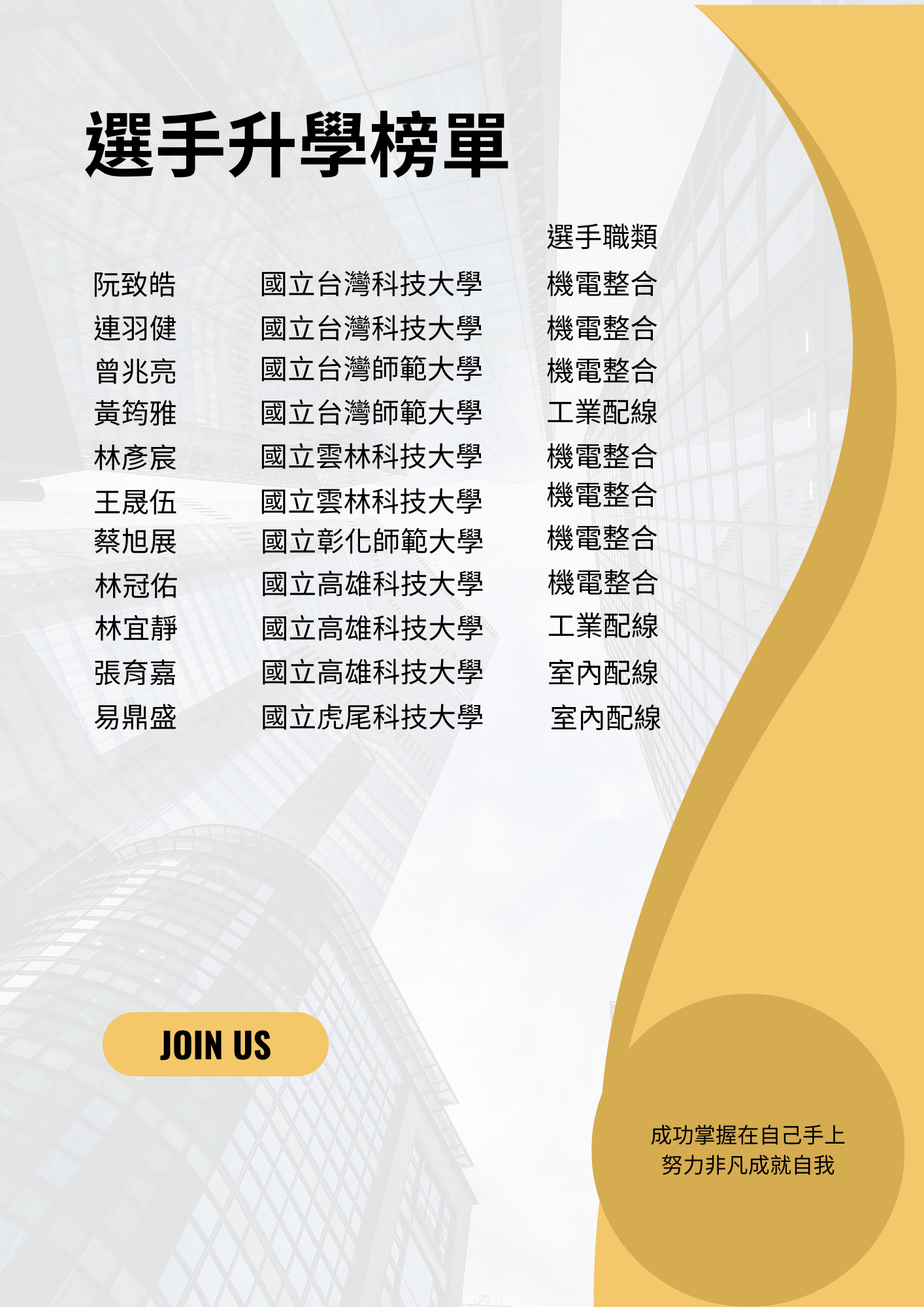 電機科應屆畢業生葉鎮銓同學獲得教育部第20屆技職之光,共取得六張乙級、七張丙級 展現技職教育務實致用之精神 乙級: 室內配線乙級、氣壓乙級、電力電子乙級、儀表電子乙級、數位電子乙級、電腦硬體裝修乙級 丙級: 室內配線丙級、氣壓丙級、工業配線丙級、工業電子丙級、電腦軟體應用丙級、機電整合丙級、電腦硬體裝修丙級